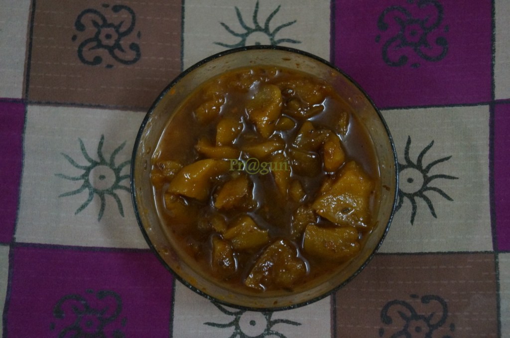 Its called gulamaba coz it has “gur” (jaggery) and “amba” ( mango) in it, also methamba as thr is touch of methi dana in it or in simple terms kairi cha god meaning raw mango’s sweet pickle…